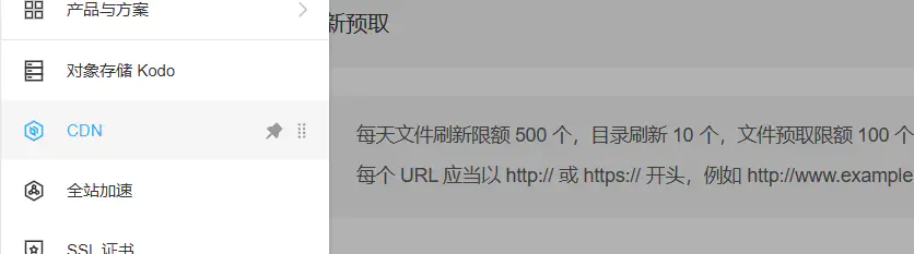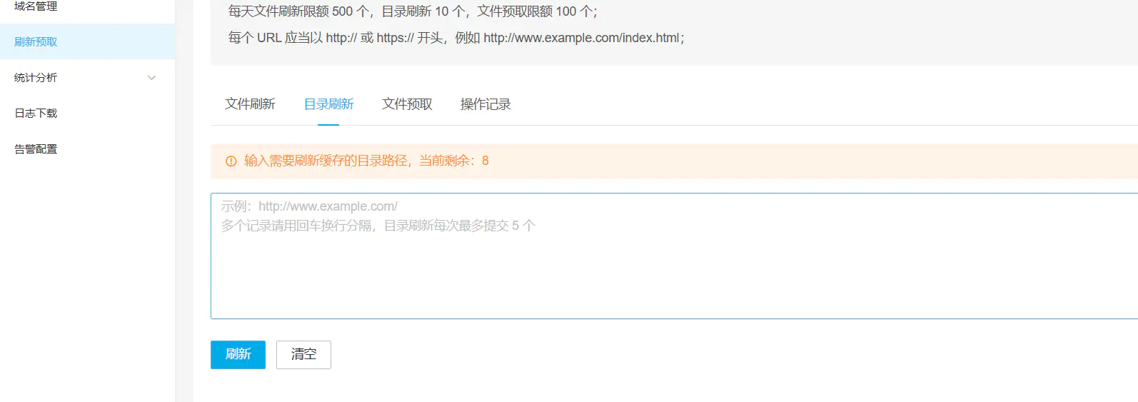 然后我们来到CDN,选择目录刷新,填写好绑定的域名的链接,要加https,例如https://www.example.com/