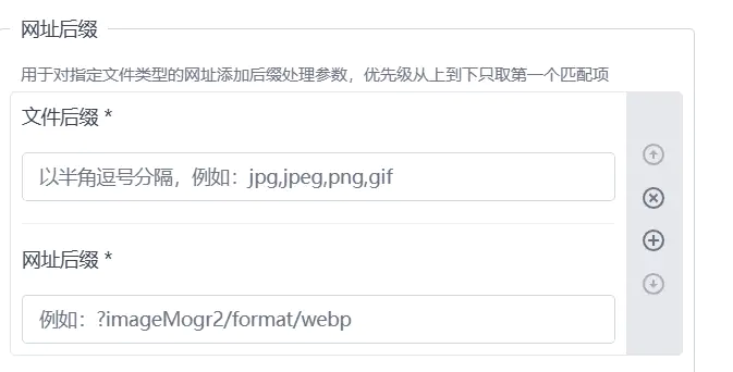 文件后缀jpg,jpeg,png,svg,bmp,webp,tiff ,网址后缀填写-和上面写的名称 ,例,你刚才写的名称是ceshi 那么这里就填-ceshi (不要丢了样式分隔符–哦)。