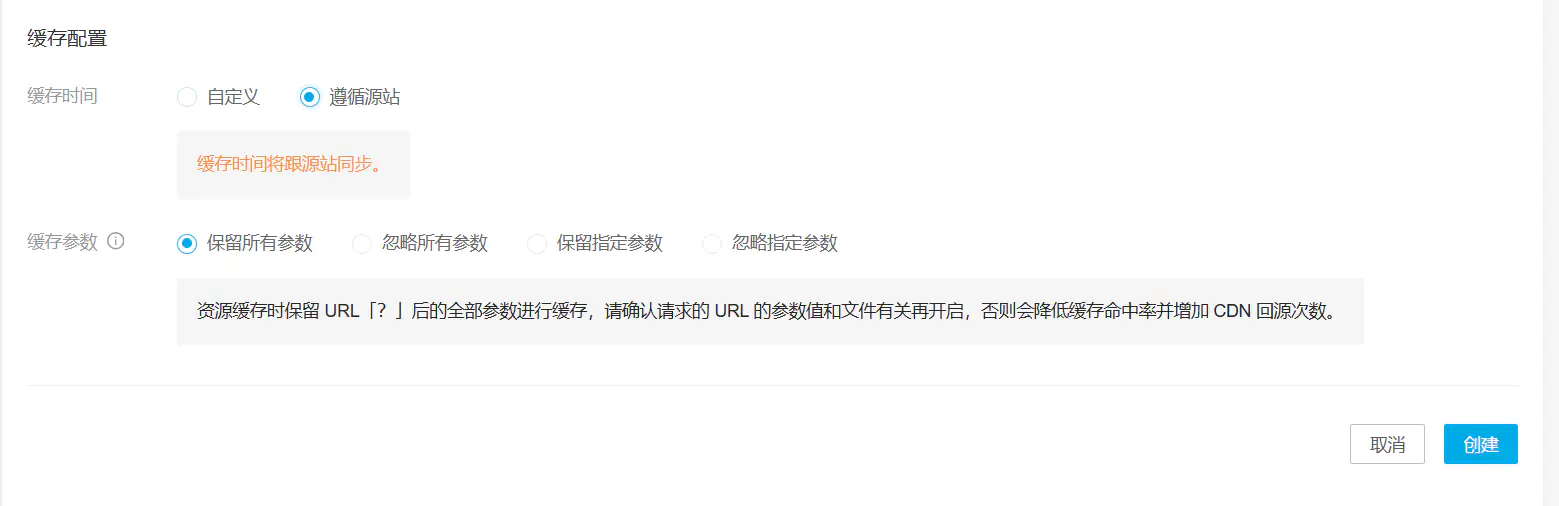 缓存配置遵循源站就好,保留所有参数(后面自定义图片样式需要)。